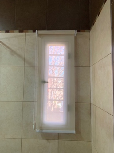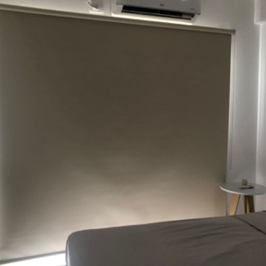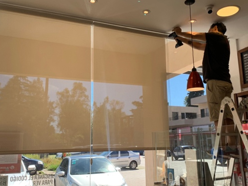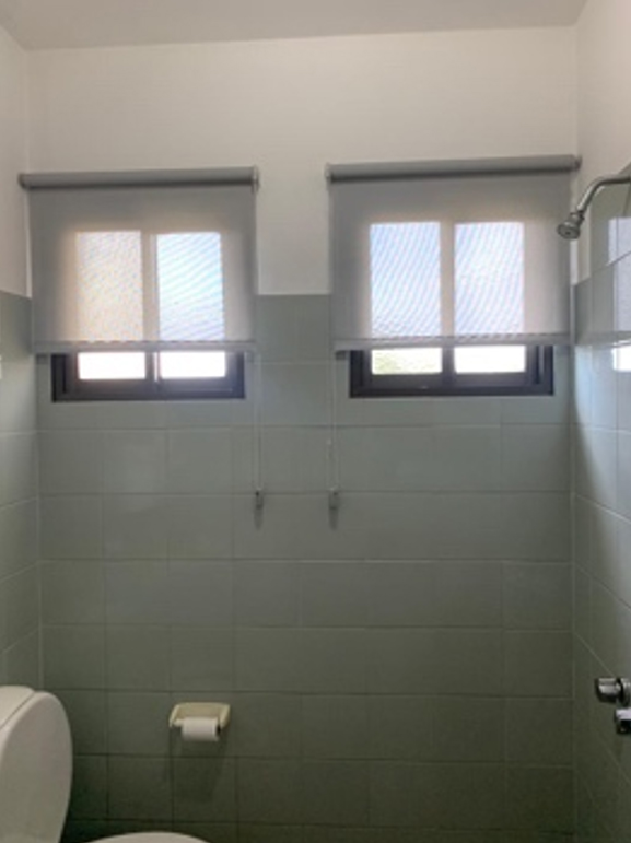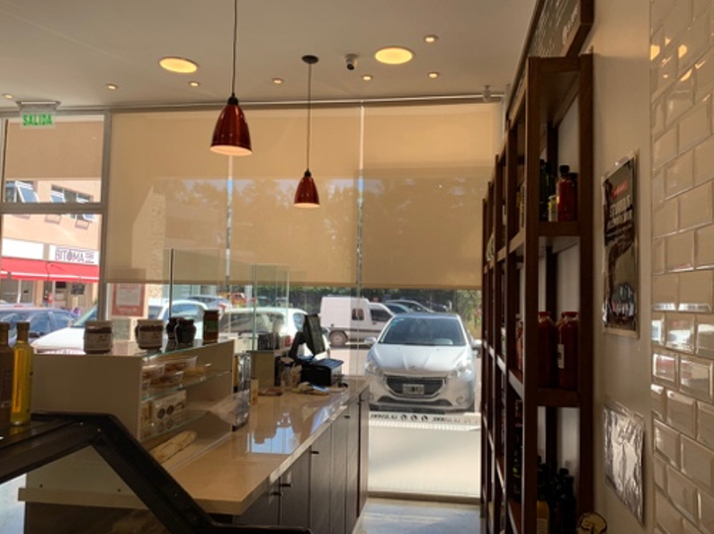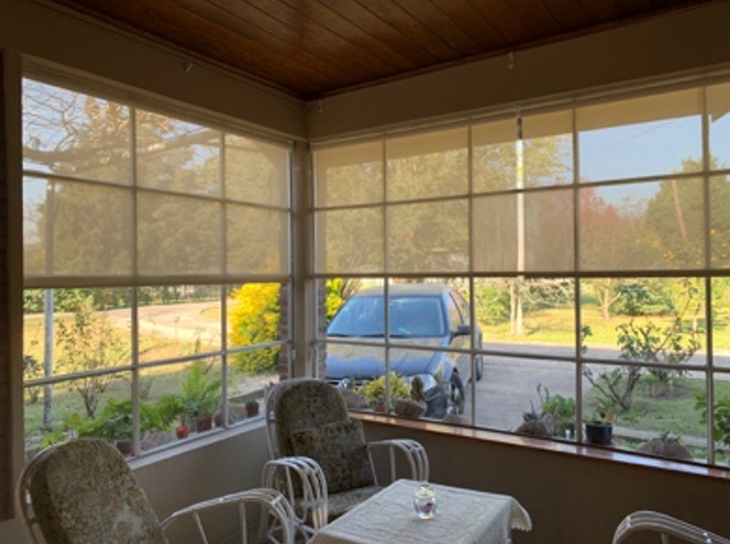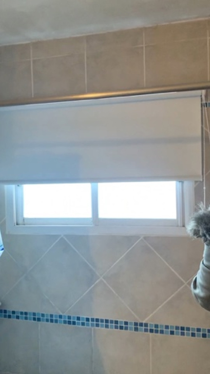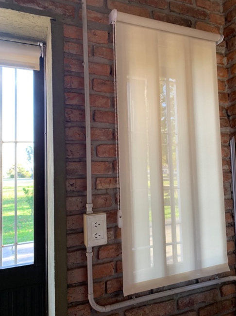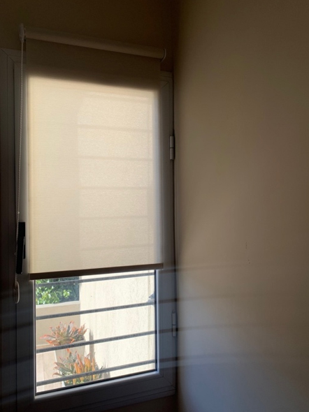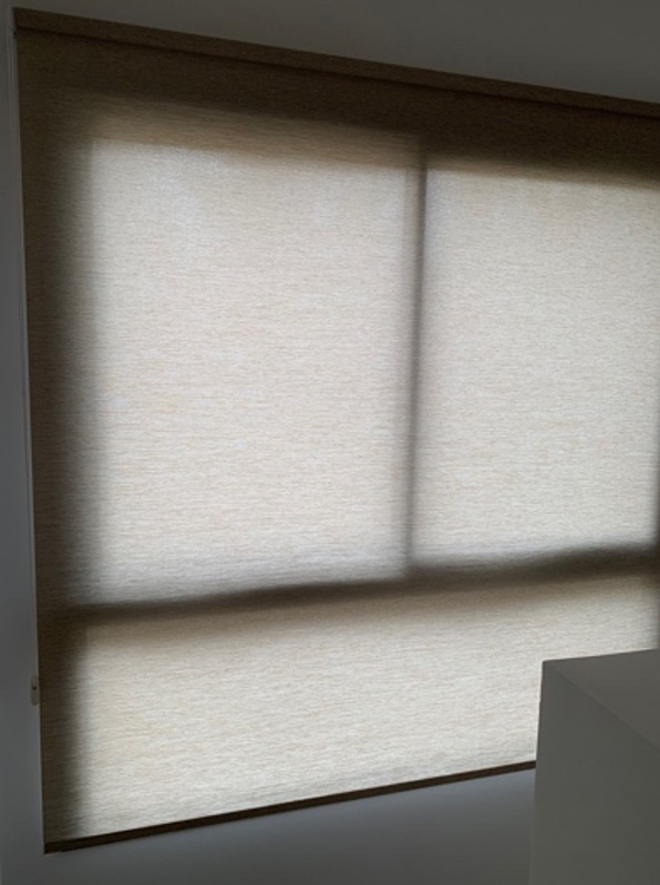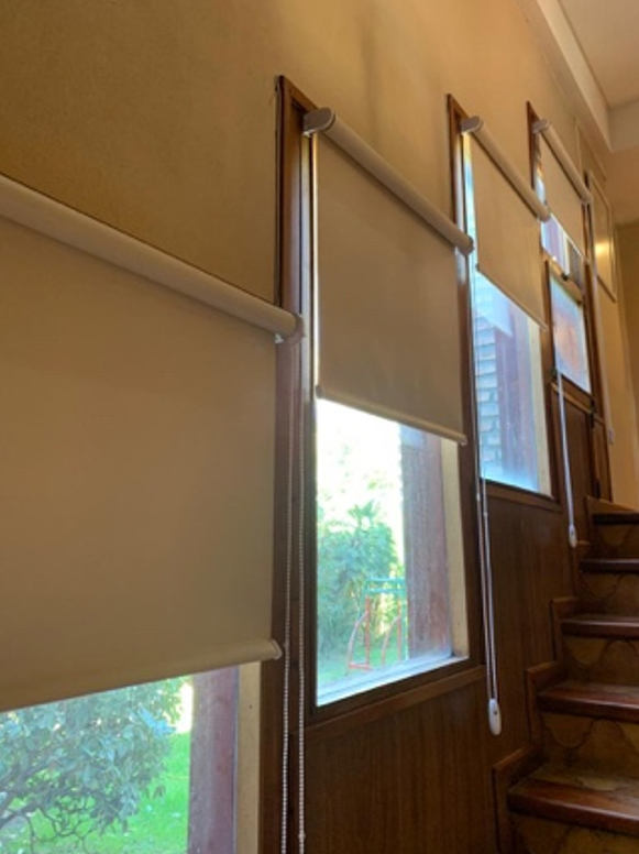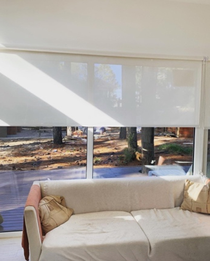 Cortinas Roller Traslúcida color beige y en baños Roller Sunscreen 5%.