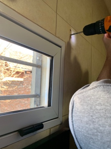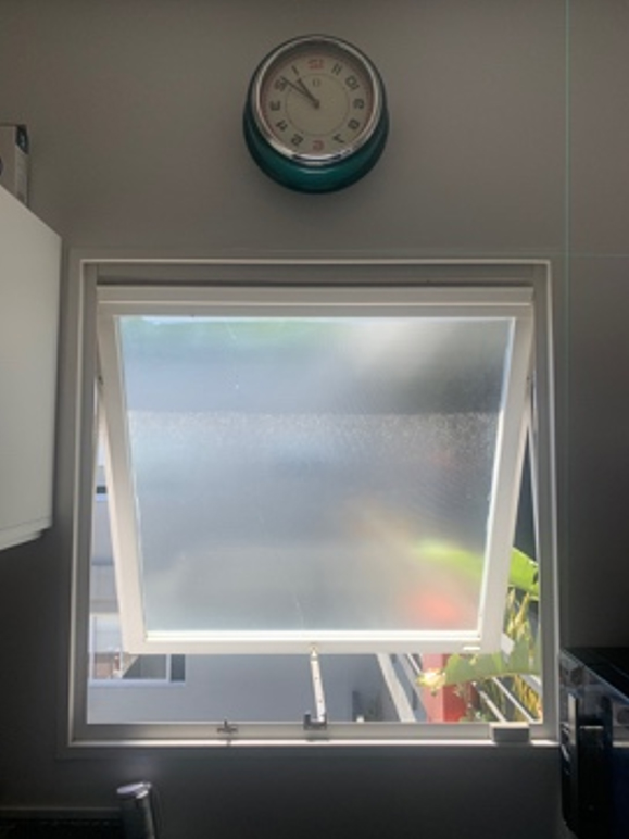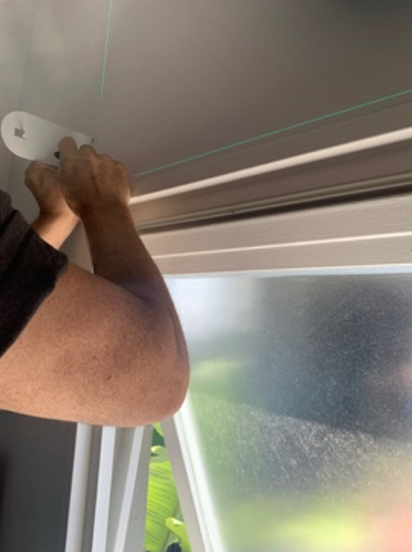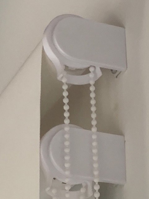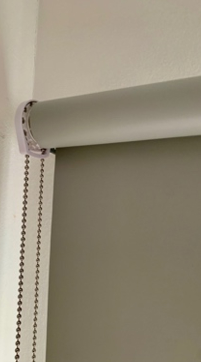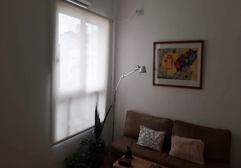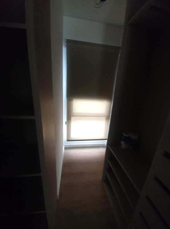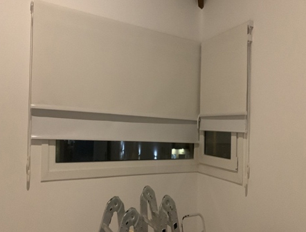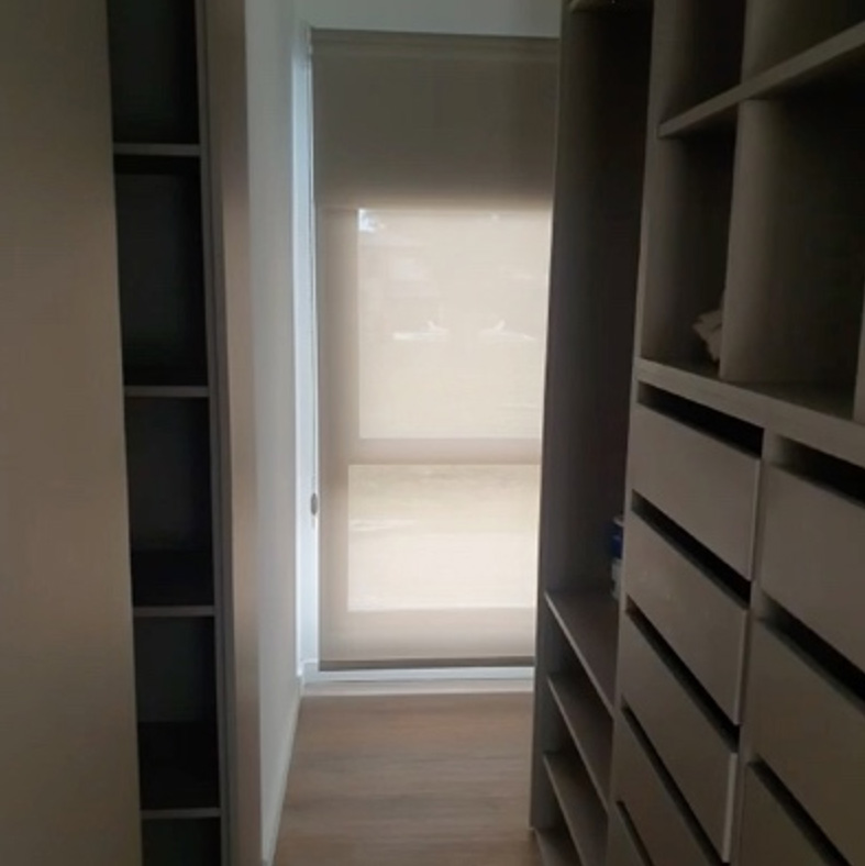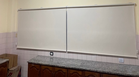 Roller Sunscreen 5% color beige en la cocina y Black Out blanco en el baño.
